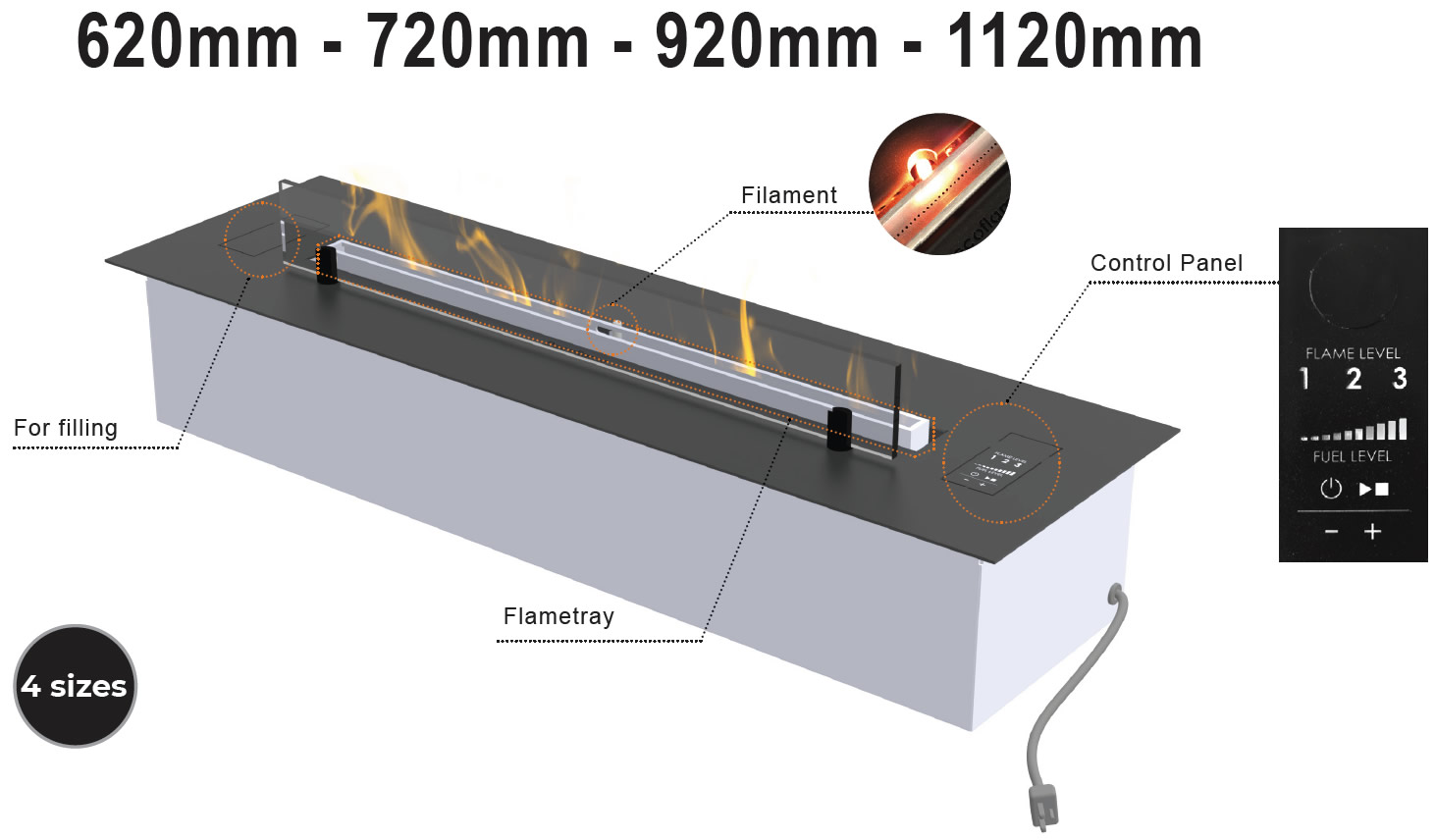Bioetanolski kaminski vložek lahko naročite v 4 različnih dimenzijah in sicer: